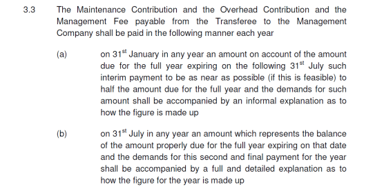 The TP1 (Transfers) for each property which set out how the management charges should be paid do not allow for monthly instalments per the relevant section from the TP1 below. This means the service charge must be paid in advance on (or as close as possible to) the defined dates.